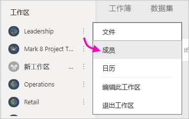 1、选择“工作区”,选择工作区名称旁边的“更多选项”(…),然后选择“成员” 。