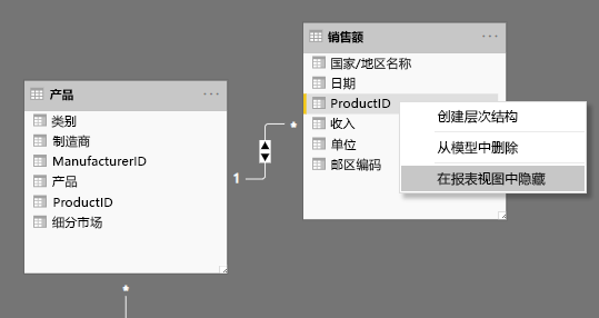 要在报表中隐藏表或单个列,请右键单击“模型”视图中的表或列,然后选择“在报表视图中隐藏”。