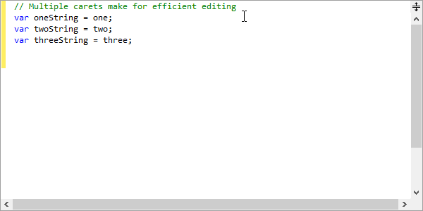 现在支持多个选择,每个选择都有自己的插入符号。在文本区域中单击、单击所选内容或行号边距时,可以通过按住Ctrl键来添加新选择。大多数编辑操作都经过重构,才能完全支持多种选择。例如,按Shift +向右箭头会将所有选择范围扩展一个字符。