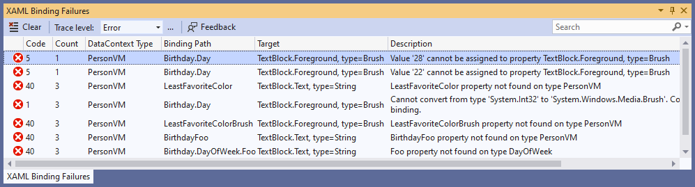 • XAML Binding Failures面板(独立的VSIX早期alpha预览):为了在开发人员的应用程序中发生数据绑定失败时为开发人员提供帮助,开发团队在开发中提供了一项新功能,该功能将专用的XAML Binding Failures面板引入Visual Studio。尽管此功能最终将对所有XAML开发人员(WPF、UWP和Xamarin.Forms)都起作用,但新面板将使为那些构建WPF应用程序的客户更容易识别绑定失败。