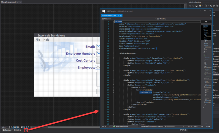 从设计器中弹出XAML编辑器(v16.4):现在,可以使用XAML标签旁边的新弹出XAML按钮轻松地将XAML设计器及其基础XAML编辑器拆分为单独的窗口。单击时,XAML设计器将最小化其附加的XAML标签,并针对XAML编辑器视图弹出一个新窗口。您可以将此新窗口移动到Visual Studio中的任何显示或标签组。注意,仍然可以扩展原始XAML视图,但不管怎样,同一个文件的所有XAML视图将保持实时同步。