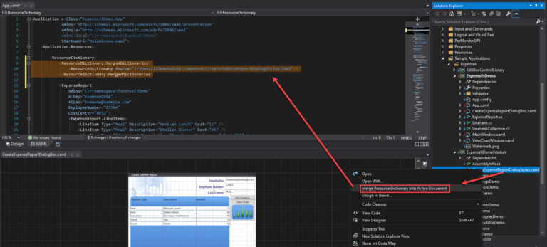 合并Resource Dictionary:现在可以使用解决方案资源管理器提供的新功能轻松地将UWP/WPF项目中的现有资源字典与任意有效的XAML文件合并。只需打开要在其中添加merge语句的XAML文件,并找到要合并的文件,然后在解决方案资源管理器中右键单击该文件即可。在上下文菜单中,选择“Merge Resource Dictionary Into Active Window”选项,这将添加正确的合并XAML路径。