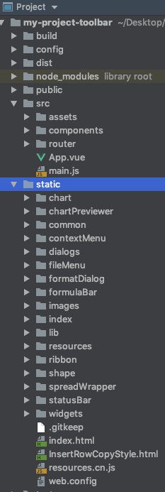 与Vue集成步骤:将SpreadJS在线表格编辑器目录中【src】下的所有文件拷贝到Vue工程目录的static文件下即可。