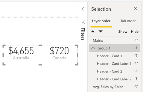 通过分组,您可以在报表页面上将视觉效果、形状、文本框、图像和按钮组合在一起,就像在PowerPoint中一样。将对象组合在一起后,您还可以将它们一起移动并调整大小,这样可以更轻松地处理每页上分层有大量对象的报表。