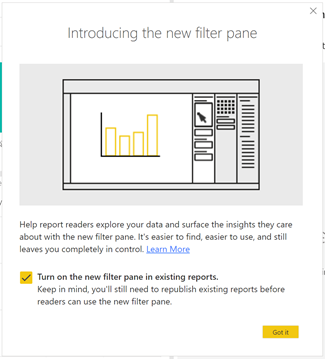 通过此对话框,您可以选择使用新的过滤器窗格体验。完成此操作后,只要您打开旧报告,它就会自动显示新的过滤器窗格。现在,如果在打开报告后保存报告,新窗格将保持不变,再次发布报告后,它将向最终用户显示。如果您尚未准备好升级特定报告,则可以通过options对话框中的报告级别设置关闭新窗格。
