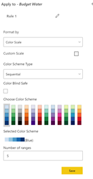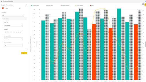 您还可以单击铅笔图标以打开条件格式菜单,该菜单允许您编写复杂的条件格式规则以应用于视觉中的任何系列。规则也将自动显示在图例中(如果需要,可以在格式化窗格中将其关闭)。