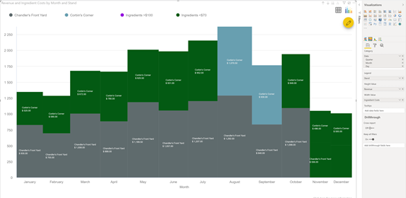 Marimekko图表是第二个xViz visual,它允许您在两个尺度上可视化分类数据,使用宽度和高度来显示它们之间的关系。您可以使用要在值轴上显示的分类值来达到此视觉效果,如添加度量来定义每个类别的高度,以及设置宽度的不同度量。您还可以向图例添加类别以进一步分割数据。