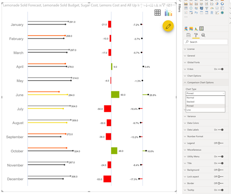 由于此可视化是xViz套件的一部分,所以它具有与多轴图表相同的优秀格式化选项,包括功能强大的条件格式化选项和高级格式化控件。