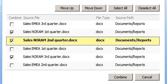 | Any combination of input files in supported formats can be converted into single output document. You can take files from all the subfolders in the document library, choose desired ones, adjust concatenation sequence via simple UI and get resulting combined file just by several clicks.