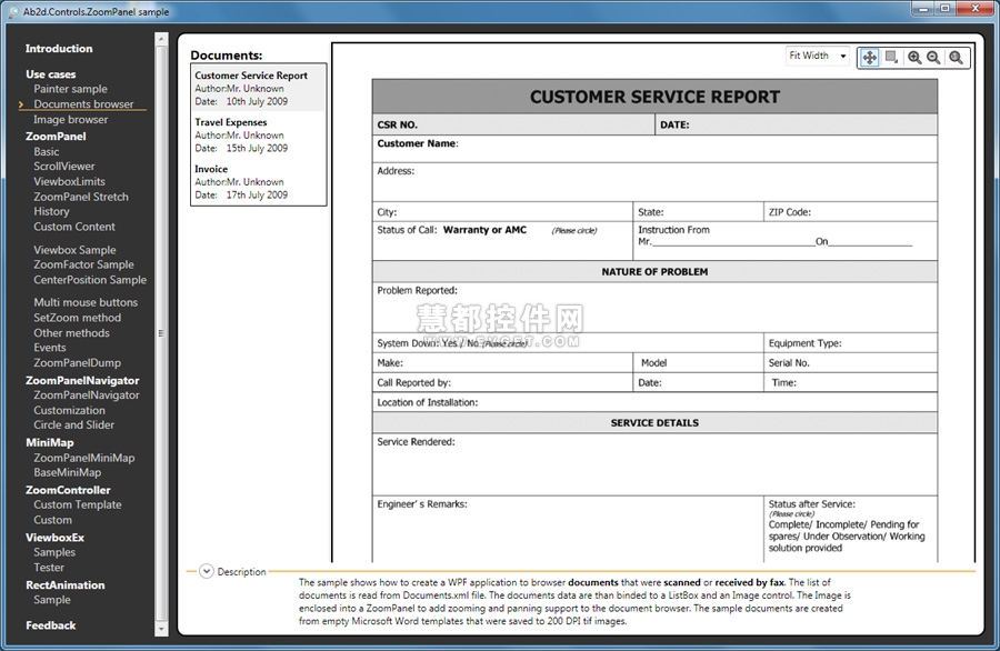 这里还有许多示例用于查看ZoomPanel和其他控件的实际运行效果。此外,其他三个用户案例示例显示了使用先进的缩放和平移来改善一个现实世界的应用程序是多么的简单(点击图片看更大的屏幕截图):