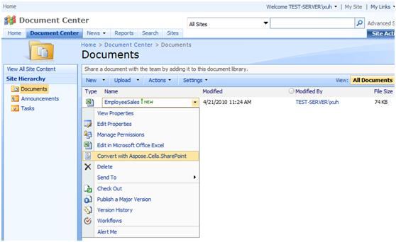Aspose.Cells for SharePoint is a flexible solution supporting spreadsheet conversion that makes it possible to convert MS Excel documents within the Microsoft SharePoint applications and support multiple document formats.