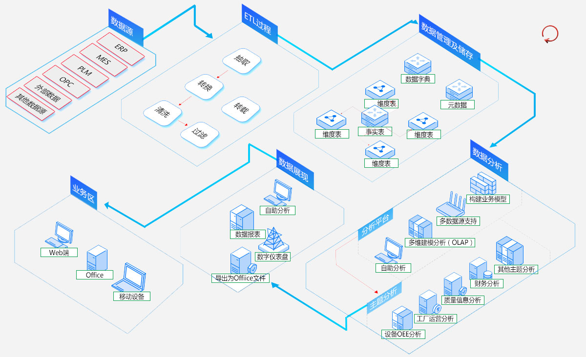 慧都对智能制造的推行提供可视化的辅助手段,对企业管理决策提供有力的分析工具,整合各业务模块数据,建立高效、统一、共享的生产制造数据分析平台。