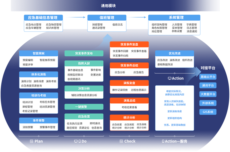 慧都应急管指挥调度系统实现平战结合,平时能够进行培训、演练,应急事件发生后, 能够通过可视化面板,迅速掌握事故信息。通过移动端、桌面端的实时互联,快速进行指挥部署, 让应急救援工作从传统救援跨越成为信息时代的智慧救援。为企业应急救援提供新思路、新模式, 通过该系统可实现: